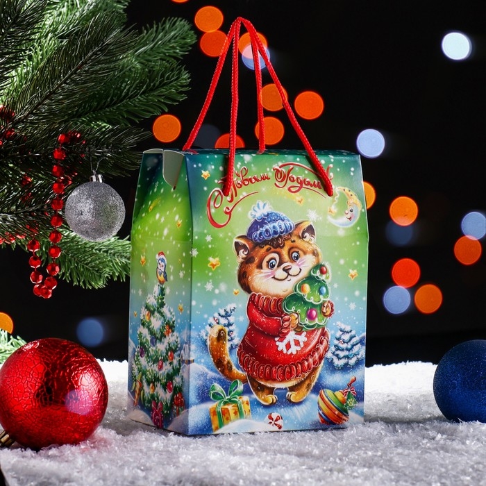 Новый год. Подарочная коробка "Котик в лесу" 15 х 10 х 20,5 см.