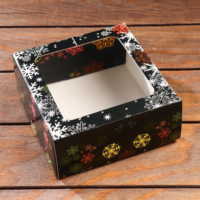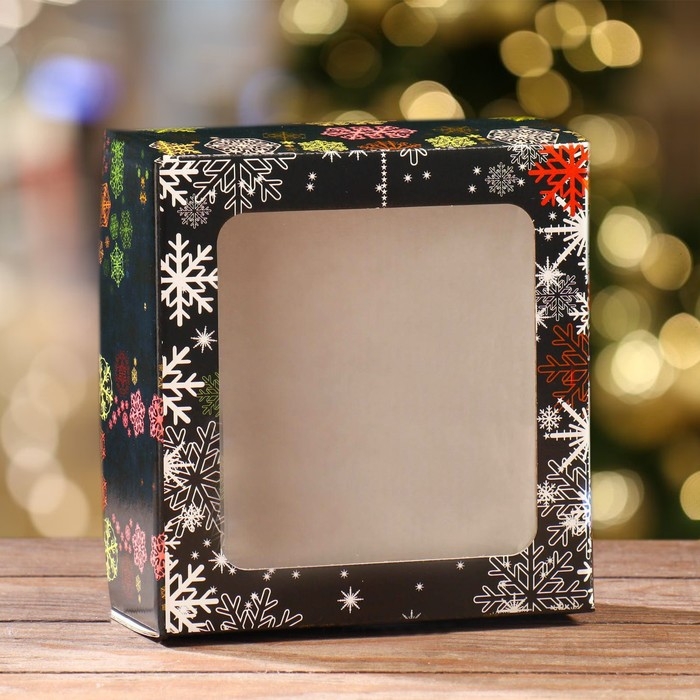 Новый год. Подарочная коробка складная, новогодняя "Разноцветные снежинки", 14,5 х 14,5 х 6 см.