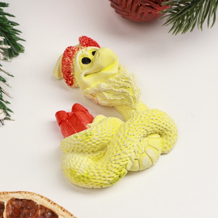 Новый год. Символ 2025. Фигура с подвесом "Змея с подарком" лимонная, 8х3см