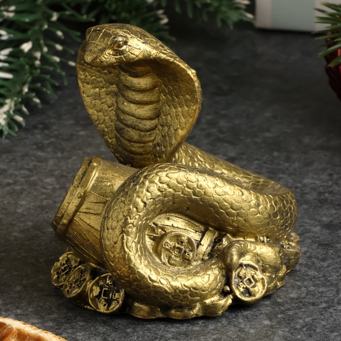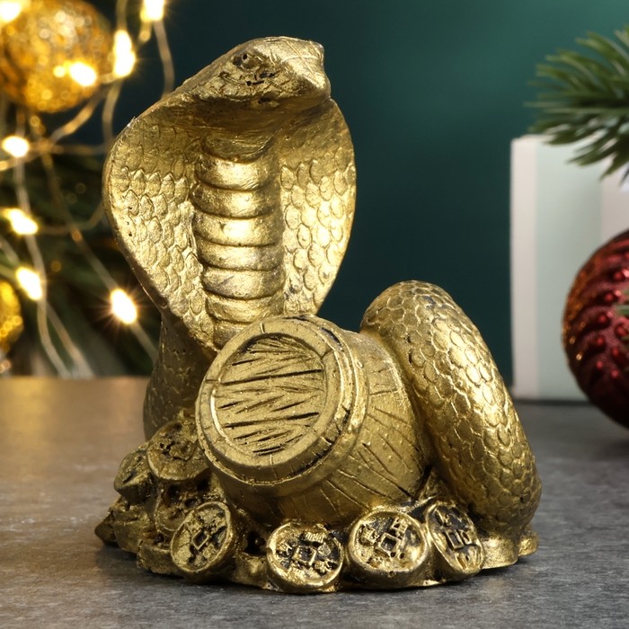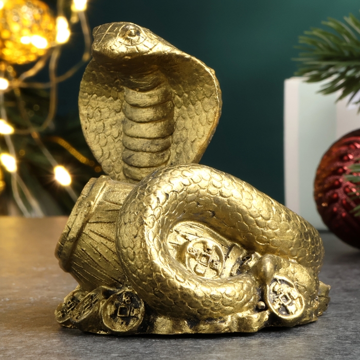 Новый год. Символ 2025. Фигура "Змея на деньгах с бочкой" старое золото, 6х6х5см