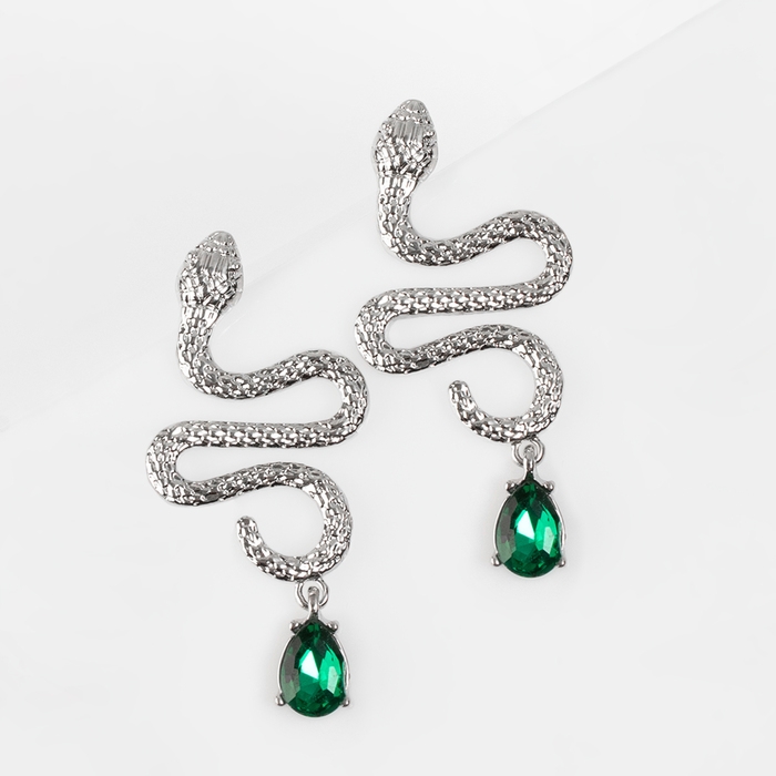 Новый год! Символ года 2025! Серьги со стразами «Змея» чарующая сила, цвет зелёный в серебре