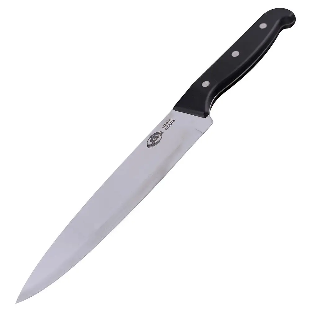 Универсальный помощник на любой кухне — нож, с которым вы легко нарежете мясо, рыбу, очистите и нашинкуете фрукты и овощи. Используйте нож для приготовления мясных и овощных блюд, салатов, супов и закусок. Острое и прочное лезвие обеспечит комфорт во время использования. Изготовлен: лезвие из коррозионностойкой (нержавеющей) стали, ручка из пластмассы (АВS). Общая длина 30,5 см, длина лезвия 19 см.