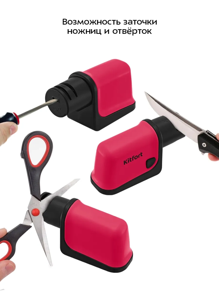Электрическая ножеточка Kitfort КТ-4099 — это идеальное решение для тех, кто хочет быстро и безопасно заточить ножи с гладкими стальными лезвиями. Это устройство также позволяет заточить ножницы и торцевать отвертки с плоским шлицем. Принцип работы электроточилки прост: при вращении керамического камня в корпусе устройства снимается тонкий слой металла с затачиваемого инструмента, что восстанавливает первоначальную форму лезвия и угол заточки. Эта точилка работает от 4 батареек типоразмера АА, которые не входят в комплект поставки. Благодаря этому вам не придется искать источник питания для включения устройства — оно всегда готово к работе там, где это необходимо. Прорезиненные вставки на дне электроточилки надежно фиксируют её на столе и предотвращают скольжение во время работы. Kitfort КТ-4099 отличается компактностью и легкостью использования, что делает её незаменимой помощницей на кухне или в мастерской. Она подходит как для профессионального использования, так и для домашнего применения. Не упустите возможность приобрести эту универсальную ножеточку по выгодной цене! На нашем сайте вы найдете все актуальные скидки на данную электро модель — следите за обновлениями раздела "скидка" чтобы не пропустить лучшие предложения! Все товары проходят строгий контроль качества перед отправкой покупателю. С помощью этой электрической точилки ваши ножи всегда будут острыми без лишних усилий!