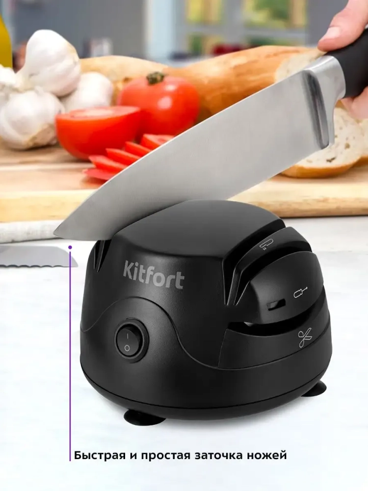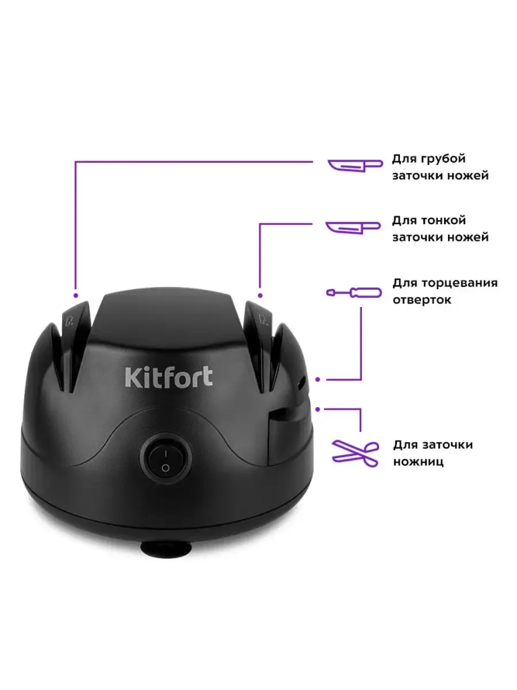 Электроточилка для ножей Kitfort КТ-4067 поможет быстро и безопасно заточить ножи с гладкими стальными лезвиями. Также данным устройством вы можете заточить ножницы и торцевать отвертки.