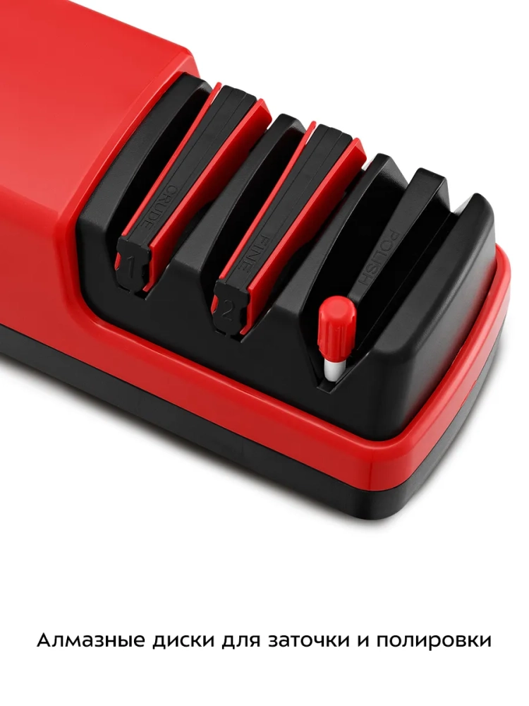 Различаются и виды заточки ножей — они подразделяются на односторонние, где лезвие затачивается с одной стороны, и на двусторонние, где лезвие затачивается с двух сторон. При односторонней затачивается лишь одна сторона лезвия, вторая остается плоской. Ножи с односторонней заточкой, как правило, чуть более острые, рез в них более точный, но рубить таким инструментом не получится. Практически все кухонные ножи имеют двустороннюю заточку, так как лезвие, заточенное таким образом, позволяет не только резать, но и рубить и распарывать. Наличие двух пазов для заточки в данной модели электроточилки позволяет осуществлять и одностороннюю, и двустороннюю заточку.