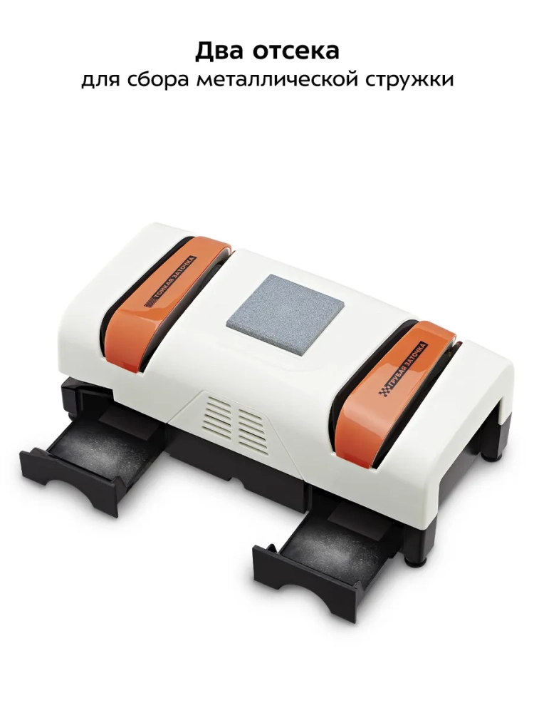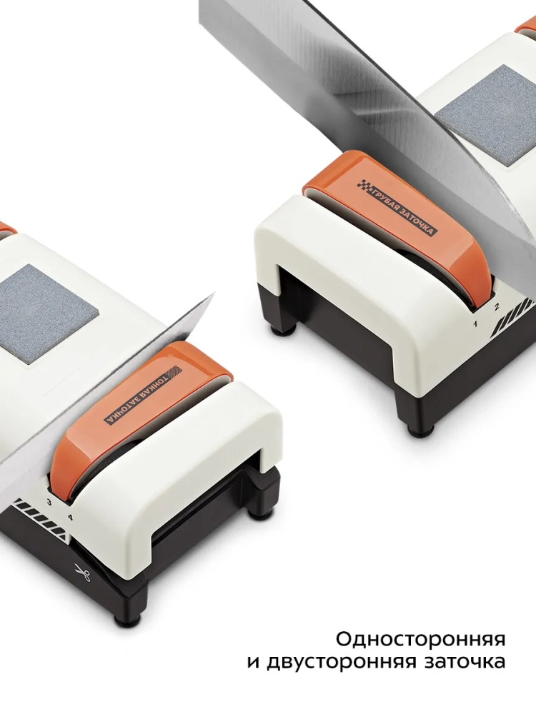 Различаются и виды заточки ножей — они подразделяются на односторонние, где лезвие затачивается с одной стороны, и на двусторонние, где лезвие затачивается с двух сторон. При односторонней затачивается лишь одна сторона лезвия, вторая остается плоской. Ножи с односторонней заточкой, как правило, чуть более острые, рез в них более точный, но рубить таким инструментом не получится. Практически все кухонные ножи имеют двустороннюю заточку, так как лезвие, заточенное таким образом, позволяет не только резать, но и рубить и распарывать. Наличие двух пазов для заточки в данной модели электроточилки позволяет осуществлять и одностороннюю, и двустороннюю заточку.