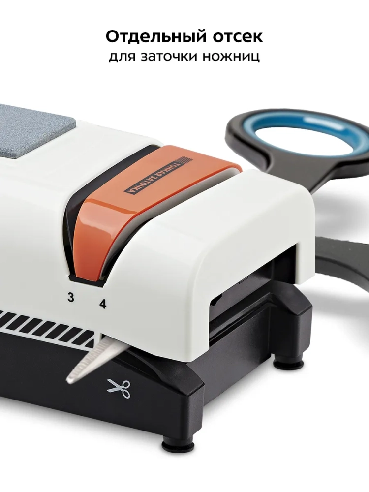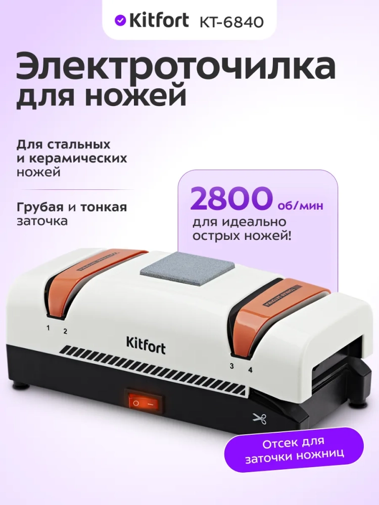 Электроточилка для ножей Kitfort КТ-6840 поможет быстро и безопасно заточить ножи с гладкими стальными или керамическими лезвиями, ножницы, а также торцевать отвертки с плоским шлицем.