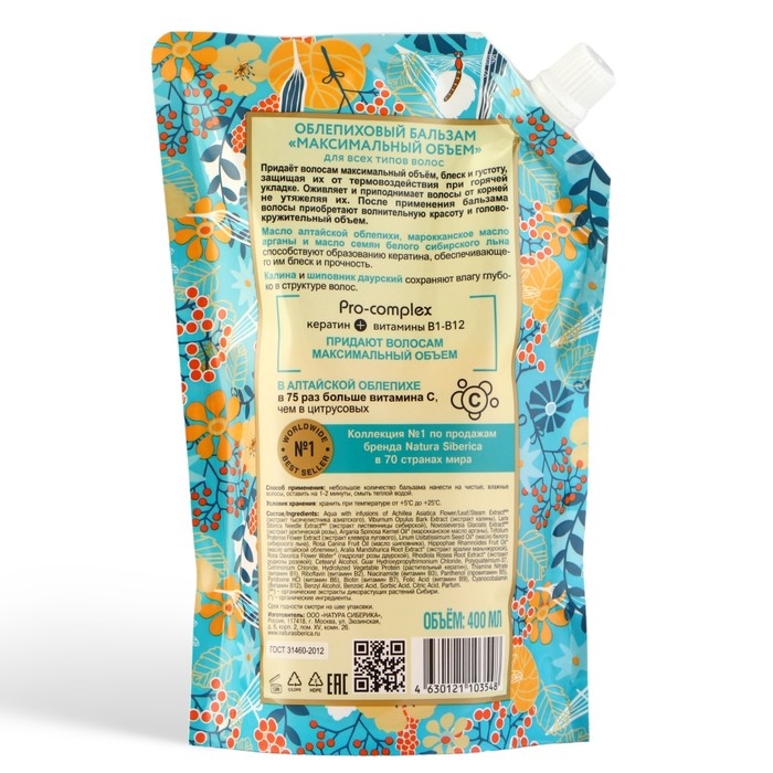 Состав: Aqua with infusions of Achillea Asiatica Flower/Leaf/Steam ExtractWH (экстракт тысячелистника азиатского), Viburnum Opulus Bark Extract (экстракт калины), Larix Sibirica Needle ExtractWH (экстракт лиственницы сибирской), Novosieversia Glacialis ExtractWH (экстракт арктической розы), Argania Spinosa Kernel Oil* (марроканское масло арганы), Trifolium Pratense Flower Extract (экстракт клевера лугового), Linum Usitatissimum Seed Oil* (масло белого сибирского льна), Rosa Canina Fruit Oil (масло шиповника), Hippophae Rhamnoides Fruit Oil* (масло алтайской облепихи), Aralia Mandshurica Root Extract* (экстракт аралии маньчжурской), Rosa Davurica Flower Water* (гидролат розы даурской), Rhodiola Rosea Root Extract* (экстракт родиолы розовой); Cetearyl Alcohol, Guar Hydroxypropyltrimonium Chloride, Polyquaternium-37, Cetrimonium Chloride, Hydrolyzed Vegetable Protein (растительный кератин), Thiamine Nitrate (витамин В1), Riboflavin (витамин В2), Niacinamide (витамин В3), Panthenol (провитамин В5), Pyridoxine HCl (витамин B6), Biotin (витамин В7), Folic Acid (витамин В9), Cyanocobalamin (Витамин В12), Benzyl Alcohol, Benzoic Acid, Sorbic Acid, Citric Acid, Parfum.