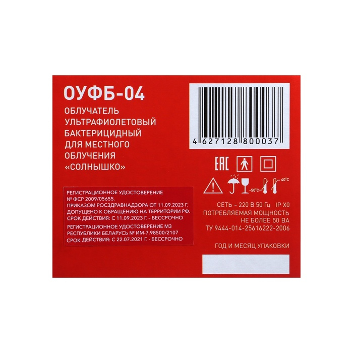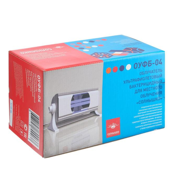 Ультрафиолетовый бактерицидный облучатель ОУФб-04 «Солнышко» предназначен для местного, локального и внутриполостного воздействия в эффективном спектральном диапазоне излучения 180–275 нм (УФС-диапазон). Применяется при воспалительных заболеваниях в отоларингологии, хирургии, для стерилизации воздуха в помещениях и обработки предметов бытового и медицинского назначения в лечебных, лечебно-профилактических, санаторно-курортных учреждениях и дома.