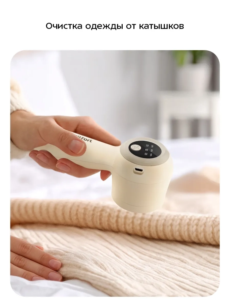 Очиститель катышков работает от аккумулятора, поэтому его можно брать с собой в путешествия или на работу. Прибор легкий, эргономичная ручка удобно лежит в руке.