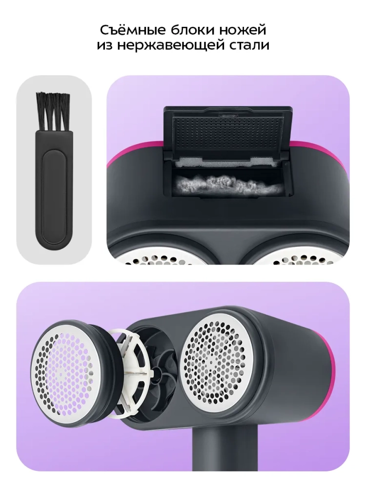 Принцип работы схож с электробритвой: защищенные металлической сеткой блоки ножей срезают комки ворса с поверхности ткани. Комки ворса попадают в отсек в корпусе прибора, который нужно очищать после каждого использования. Съемные блоки ножей сделаны из нержавеющей стали. В комплекте идет щеточка для очистки ножей.