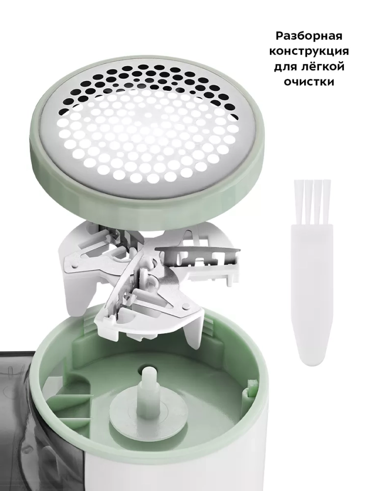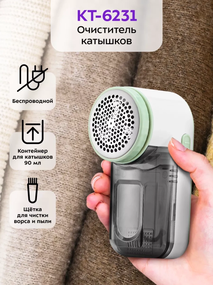 Очиститель катышков Kitfort KT-6231 вернет вашей одежде ухоженный вид, счистив с нее появившиеся катышки. Катышки появляются на одежде из-за неправильного ухода, частой и неправильной стирки, износа или из-за примеси полиэстера в тканях одежды. Принцип работы схож с электробритвой — защищенный металлической сеткой блок ножей срезает комки ворса с поверхности ткани. Съемный блок ножей сделан из нержавеющей стали. Комки ворса попадают в контейнер, который нужно очищать после каждого использования. В комплекте идет щеточка, которая предназначена для очистки ножей. У очистителя катышков есть щетка для чистки одежды от ворса и пыли, которая закрывается крышкой. Для защиты от включения без установленной защитной сетки предусмотрен специальный переключатель. Благодаря этому включить устройство можно только, если защитная сетка установлена. Очиститель катышков работает от 2 батареек типа АА, также он легкий и компактный, поэтому его можно брать с собой в путешествия или на работу. Прибор можно использовать для любых тканей из хлопка, шерсти или льна. Скорость вращения ножей: 7000 об/мин. Емкость отсека для сбора катышков: 90 мл