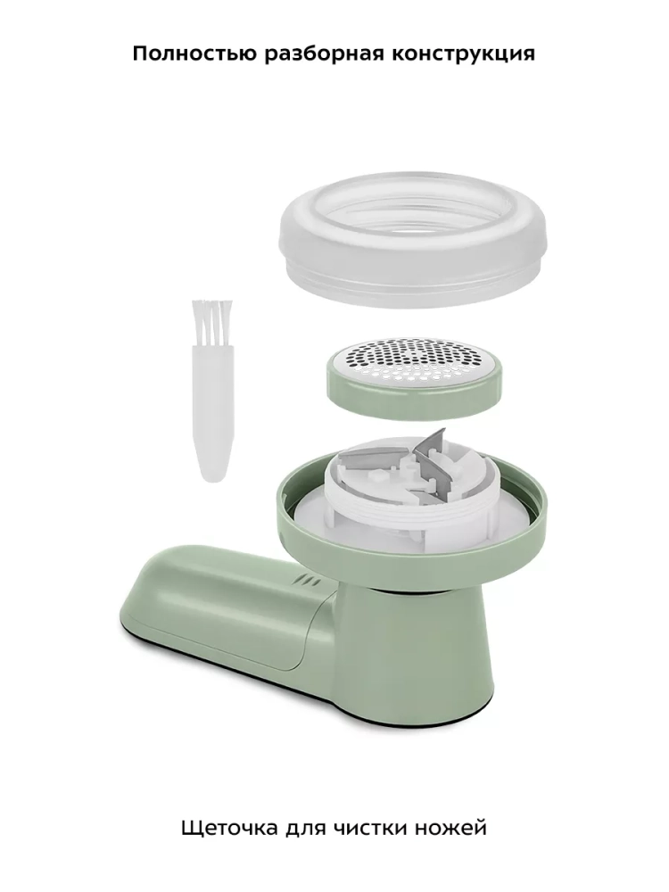 Принцип работы схож с электробритвой — защищенный металлической сеткой блок ножей срезает комки ворса с поверхности ткани. Съемный блок ножей сделан из нержавеющей стали. Комки ворса попадают в контейнер, который нужно очищать после каждого использования. В комплекте идет щеточка, которая предназначена для очистки ножей.