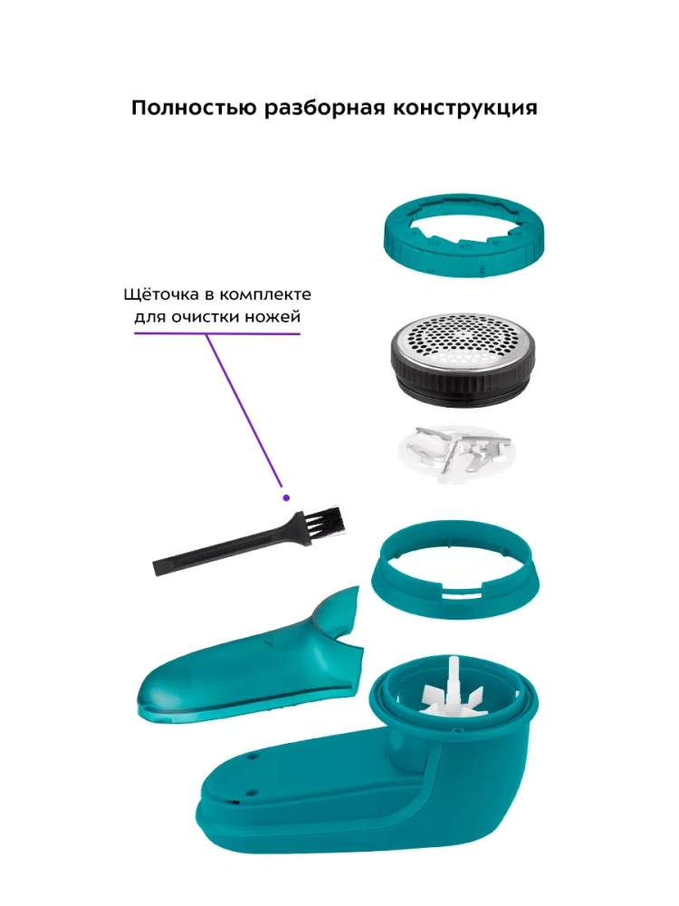 Принцип работы схож с электробритвой — защищенный металлической сеткой блок ножей срезает комки ворса с поверхности ткани. Съемный блок ножей сделан из нержавеющей стали. Комки ворса попадают в контейнер, который нужно очищать после каждого использования. В комплекте идет щеточка, которая предназначена для очистки ножей.