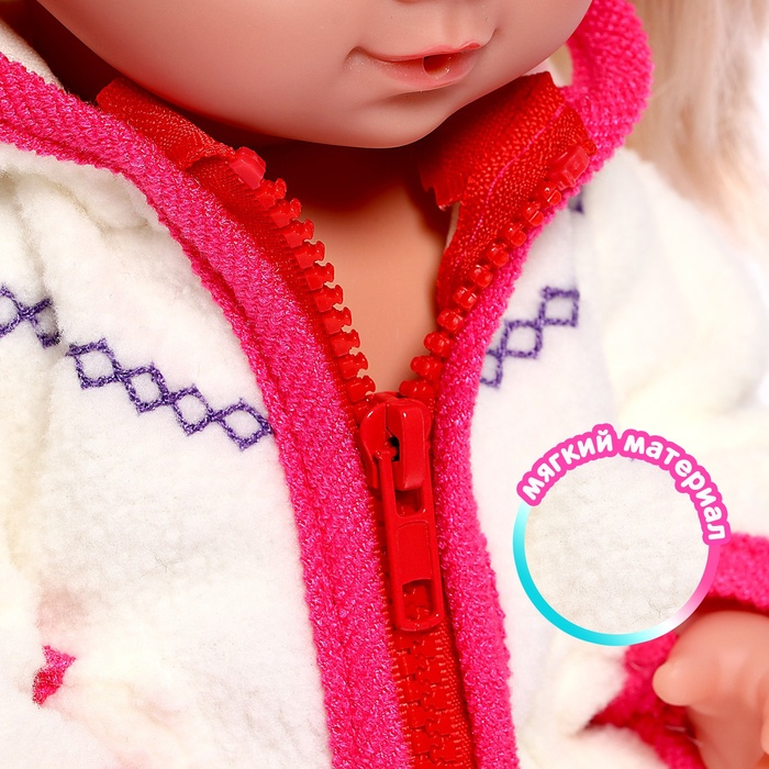 Этот комплект обязательно порадует ребёнка и разнообразит игру с пупсом, ведь малышкам так нравится наряжать своих кукол. Одежда изготовлена из качественных, безопасных материалов, приятных на ощупь, ткань окрашена в нежные тона. В комплект входит кофточка и штанишки.