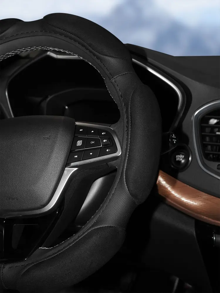 Оплетка черного цвета из спонжа размера М имеет диаметр 38 см. Оплетка легко устанавливается на руль из-за эластичных свойств спонжа. Основная расцветка изделия черная. Оплетка не вызывает трудностей при эксплуатации, т.к. обладает водоотталкивающими свойствами и легко чистится.