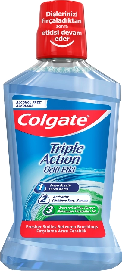 Ополаскиватель для полости рта COLGATE Тройное действие предназначен для комплексного ухода за полостью рта в сочетании с подходящей зубной пастой и зубной щёткой.