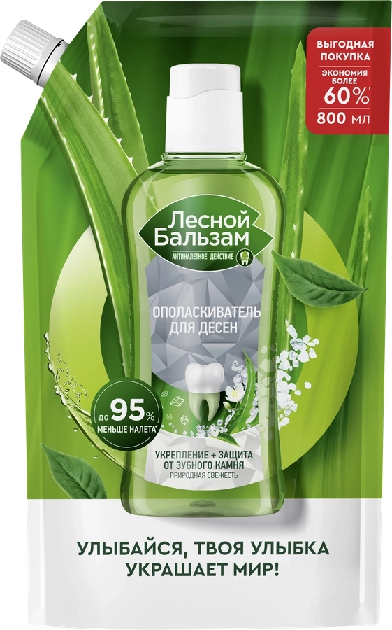 Ополаскиватель для полости рта ЛЕСНОЙ БАЛЬЗАМ Природная свежесть с морской солью, алоэ и экстрактом белого чая. Формула ополаскивателя на 98% состоит из ингредиентов натурального происхождения, интенсивно очищает зубы от налета, защищает от зубного камня и препятствует развитию кровоточивости десен, обеспечивая комплексную защиту всей полости рта. Борется с первопричиной развития серьезных проблем полости рта – зубным налетом, который вызывает кариес, влияет на изменение цвета зубов, приводит к образованию зубного камня и кровоточивости десен. Формула ополаскивателя усилена минеральными компонентами и экстрактами трав, не содержит парабенов и спирта. Морская соль помогает предотвратить разрушающее действие налета на эмаль зубов: сок алоэ и экстракт белого чая укрепляют десны, защищают от кровоточивости.
