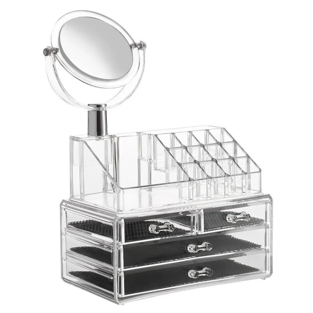 Органайзер для хранения косметики с зеркалом Cosmetic Organizer пригодится всем любителям порядка в доме. Соберите всю свою косметику в удобные ящички и навсегда решите проблему потерянных принадлежностей. Органайзер состоит из двух отделов. Верхний оснащен ячейками для помад, разнообразных тюбиков, баночек, кисточек. Нижний имеет три выдвижных ящика для различных мелочей. В комплект входит зеркало, его можно настраивать по желанию. А, благодаря простому и лаконичному дизайну, устройство прекрасно впишется в любой интерьер. Органайзер изготовлен из прозрачного акрила, а это значит, вы всегда будете знать в каком отделении находится нужная вам вещица и не будете тратить драгоценное время на поиски.