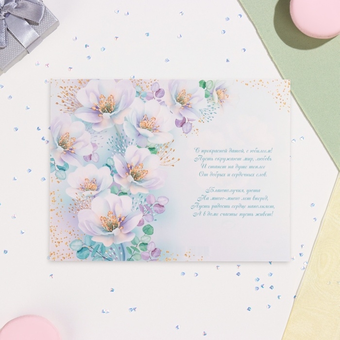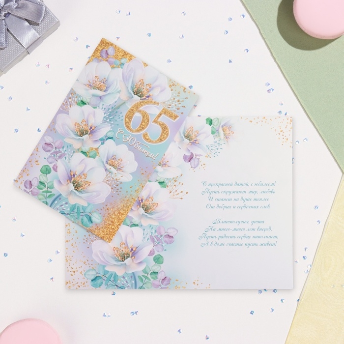 Открытка "С Юбилеем! 65" глиттер, конгрев, белые цветы, 19 х 29 см