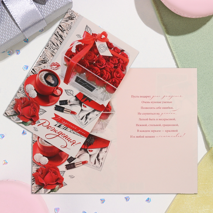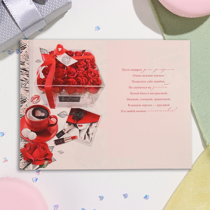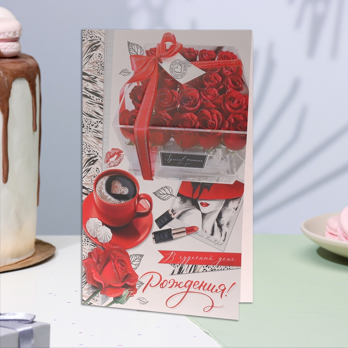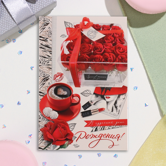 Открытка "В чудесный День Рождения!" глиттер, конгрев, красные розы, 19х29 см