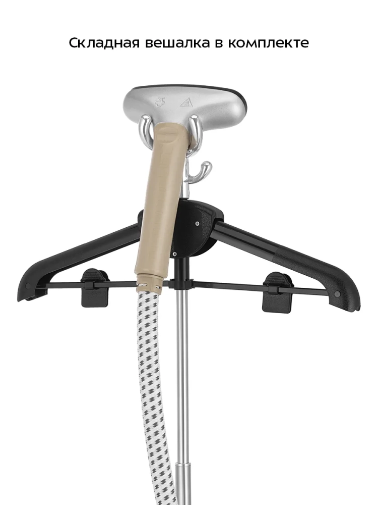 КТ-9354 оснащен складной вешалкой для одежды с прищепками. Также вешалку с одеждой можно закрепить на отпаривателе, повесив ее на крючки на держателе утюжка. Таким образом вам не придется перевешивать одежду с вешалок, на которых она хранится в шкафу. В комплекте есть защитная варежка, которая поможет избежать ожогов при отпаривании, и ворсовая щетка-зажим, которая поможет счистить волосы и шерсть домашних животных с одежды и обивки мягкой мебели. Щетку-зажим можно использовать для создания стрелок на брюках.