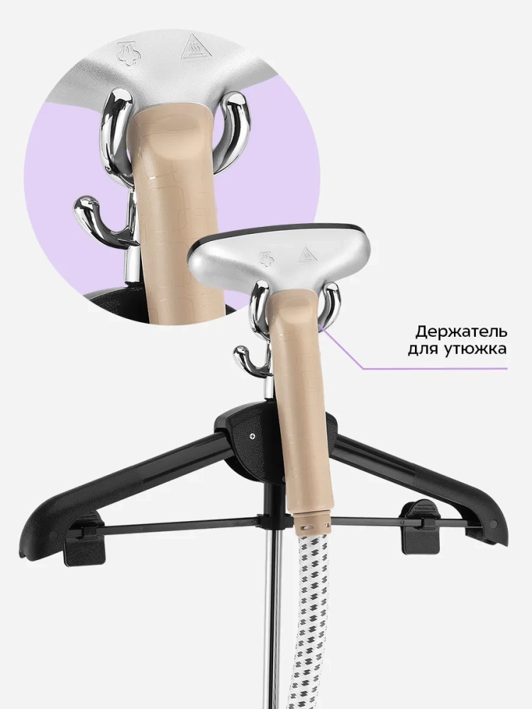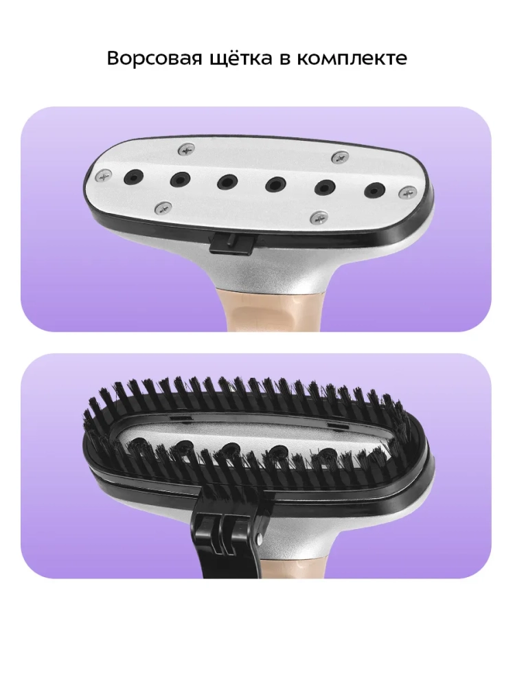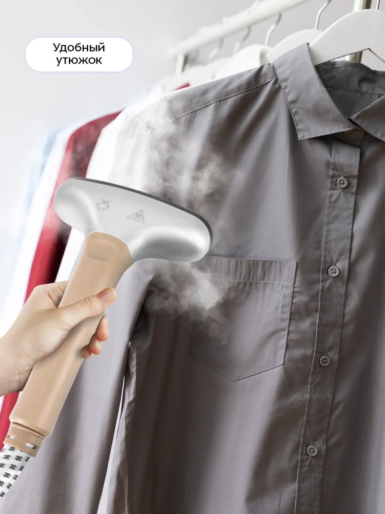 КТ-9357 оснащен складной вешалкой для одежды с прищепками. Также вешалку с одеждой можно закрепить на отпаривателе, повесив ее на крючки на держателе утюжка. Таким образом вам не придется перевешивать одежду с вешалок, на которых она хранится в шкафу. В комплекте есть защитная варежка, которая поможет избежать ожогов при отпаривании, и ворсовая щетка-зажим, которая поможет счистить волосы и шерсть домашних животных с одежды и обивки мягкой мебели. Щетку-зажим можно использовать для создания стрелок на брюках.