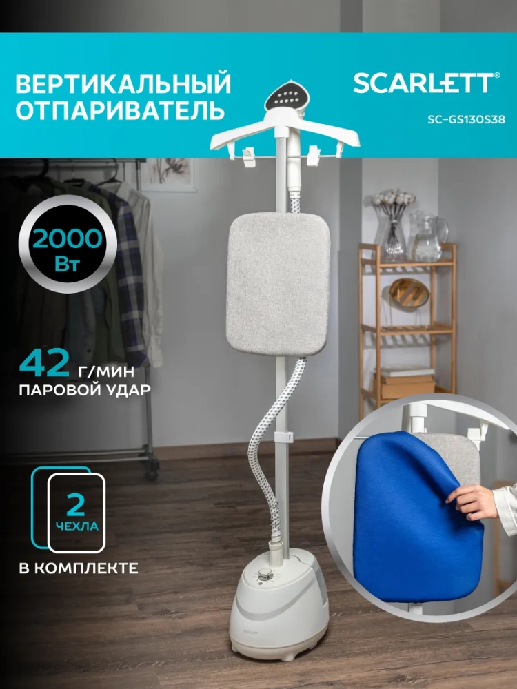 Отпариватель SC-GS130S38 — это удобное устройство, позволяющее легко и эффективно приводить в порядок любую одежду. Он обеспечивает профессиональный уход за вещами в домашних условиях. В комплект входят аксессуары, такие как щётка для шерстяных и деликатных тканей, а также сменный чехол для гладильной доски.