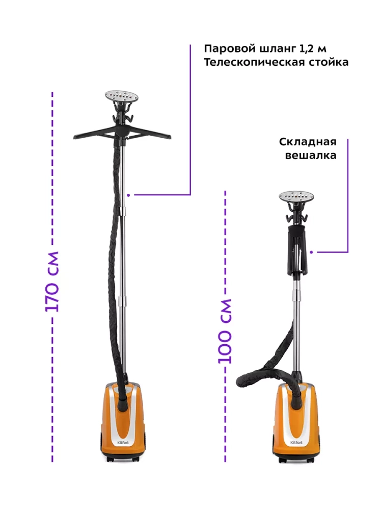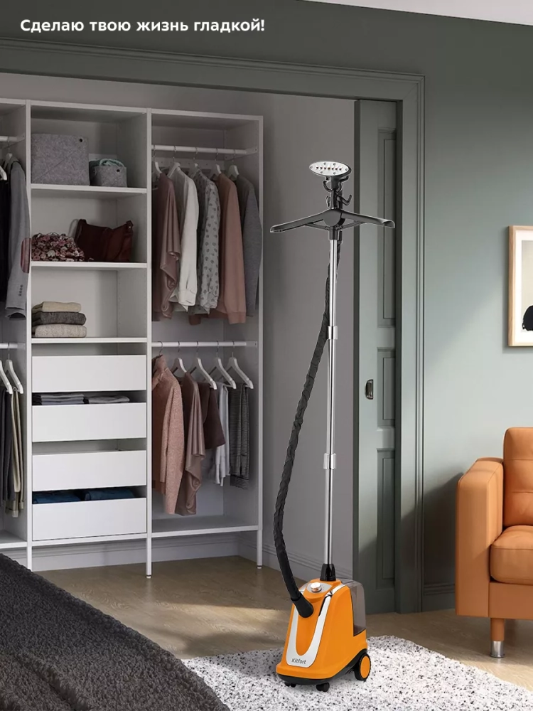 Отпариватель Kitfort КТ-9159 позволяет быстро прогладить любые вещи и изделия из текстиля. В отличие от утюгов, которыми гладят ткани и одежду, расположенные горизонтально, отпаривателем обрабатывают одежду и ткани, расположенные вертикально. Никаких дополнительных приспособлений вроде гладильной доски здесь не требуется. При отпаривании одежда может висеть на вешалке отпаривателя или на обычной вешалке, подвешенной на крючки держателя утюжка, на сушилке для белья или на веревке.