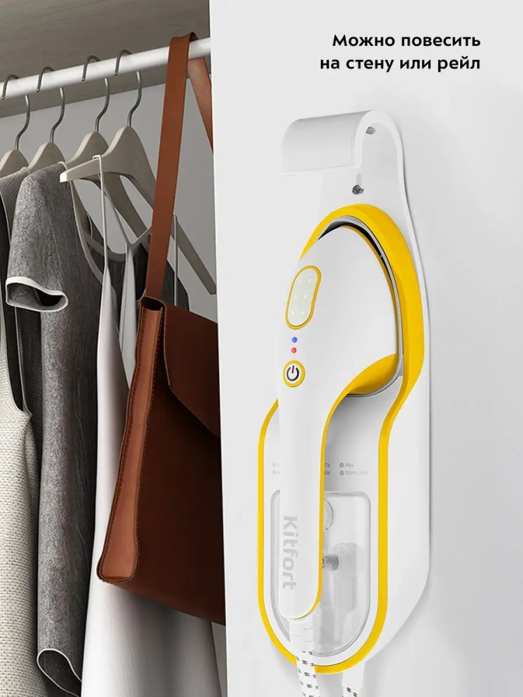 Ручной отпариватель Kitfort КТ-9130 предназначен для разглаживания изделий из текстиля с помощью потока горячего пара. Устройство обладает такими достоинствами, как мощный поток пара, минималистичный дизайн, удобство при использовании и хранении. Его можно брать с собой в дорогу, а дома — повесить на стене или штанге для одежды. В базе предусмотрено отверстие для настенного крепления, а также крепление на штангу для одежды. А противоскользящие ножки фиксируют отпариватель на горизонтальной поверхности. База также оснащена термостойкими вставками, чтобы вы могли положить на базу нагретый утюжок после отпаривания. На задней стороне базы размещен отсек для хранения шнура.