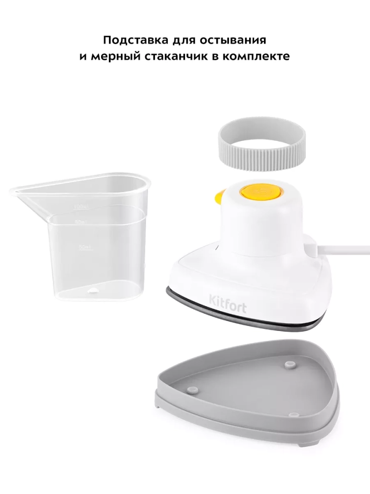В комплекте к устройству идет мерный стакан для удобного наполнения резервуара и подставка с термозащитными вставками, на которую можно установить горячий отпариватель, чтобы избежать возможных ожогов и порчи поверхности, на которой он лежит.