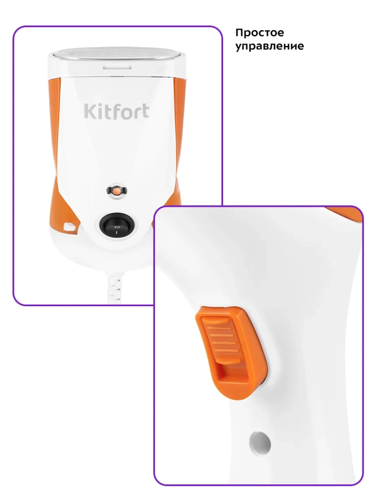 В отпаривателе КТ-9268 управление подачей пара осуществляется с помощью одной кнопки на ручке прибора. Шнур отпаривателя оснащен защитой от перегиба, что увеличивает срок службы прибора. В комплекте предусмотрена ворсовая насадка, которая поможет очистить вещи от пыли, ворса, волос и шерсти домашних животных. Для удобства заполнения резервуара для воды в комплекте есть мерный стакан.