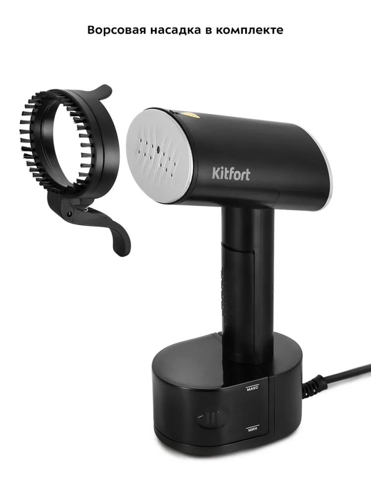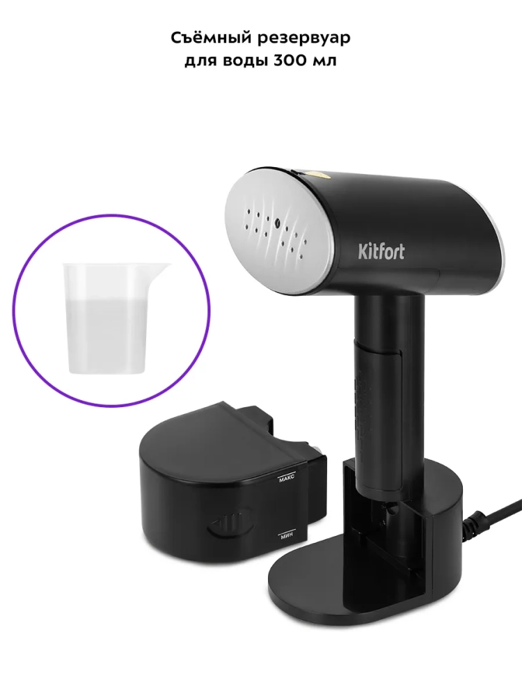 Шнур отпаривателя оснащен защитой от перегиба, что увеличивает срок службы прибора. В комплекте предусмотрена ворсовая насадка-зажим, которая поможет очистить вещи от пыли, ворса, волос и шерсти домашних животных, а также создать стрелки на брюках. Для удобства заполнения резервуара для воды в комплекте есть мерный стакан.