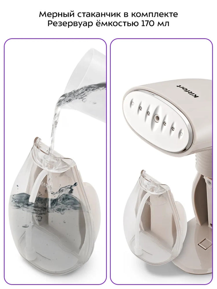 В отпаривателе КТ-9280 управление подачей пара осуществляется с помощью одной кнопки на ручке прибора. Шнур отпаривателя оснащен защитой от перегиба, что увеличивает срок службы прибора. Для удобства заполнения резервуара для воды в комплекте есть мерный стакан.