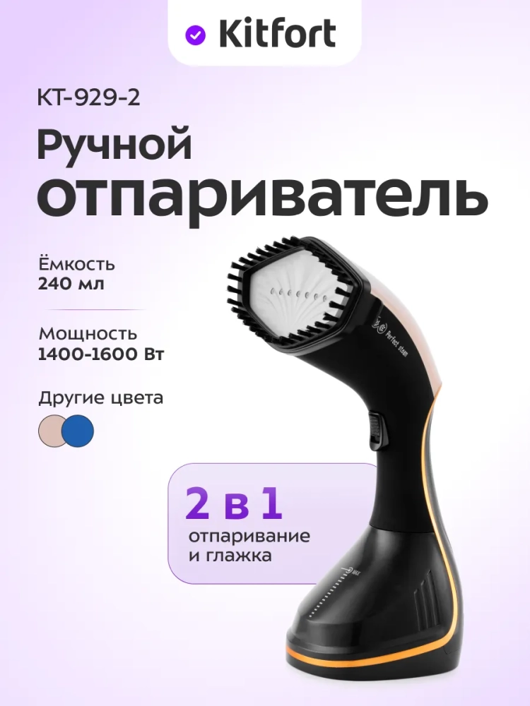 Лёгкий и компактный ручной отпариватель Kitfort КТ-929 выглядит современно и красиво. Его удобно брать с собой в поездки, ручной отпариватель незаменим для быстрого приведения одежды в порядок. Обычно ручные отпариватели маломощные и дают мало пара. Однако у этого отпаривателя мощность 1500 Вт - такая же, как у большинства напольных отпаривателей. Рабочая поверхность отпаривателя имеет антипригарное покрытие, поэтому прибор можно использовать не только для отпаривания, но и для сухой глажки. Помимо отпаривания и глажки одежды вы можете отпарить занавески и портьеры (для этого их не обязательно снимать), обивку мягкой мебели, матрасы, кровати. При этом вы не только разгладите складки, но и освежите вещи, а также продезинфицируете их, так как горячий пар хорошо убивает пылевых клещей и другие микроорганизмы. В дно резервуара для воды установлен деминерализационный фильтр, поэтому вы можете использовать водопроводную воду, не боясь образования накипи.