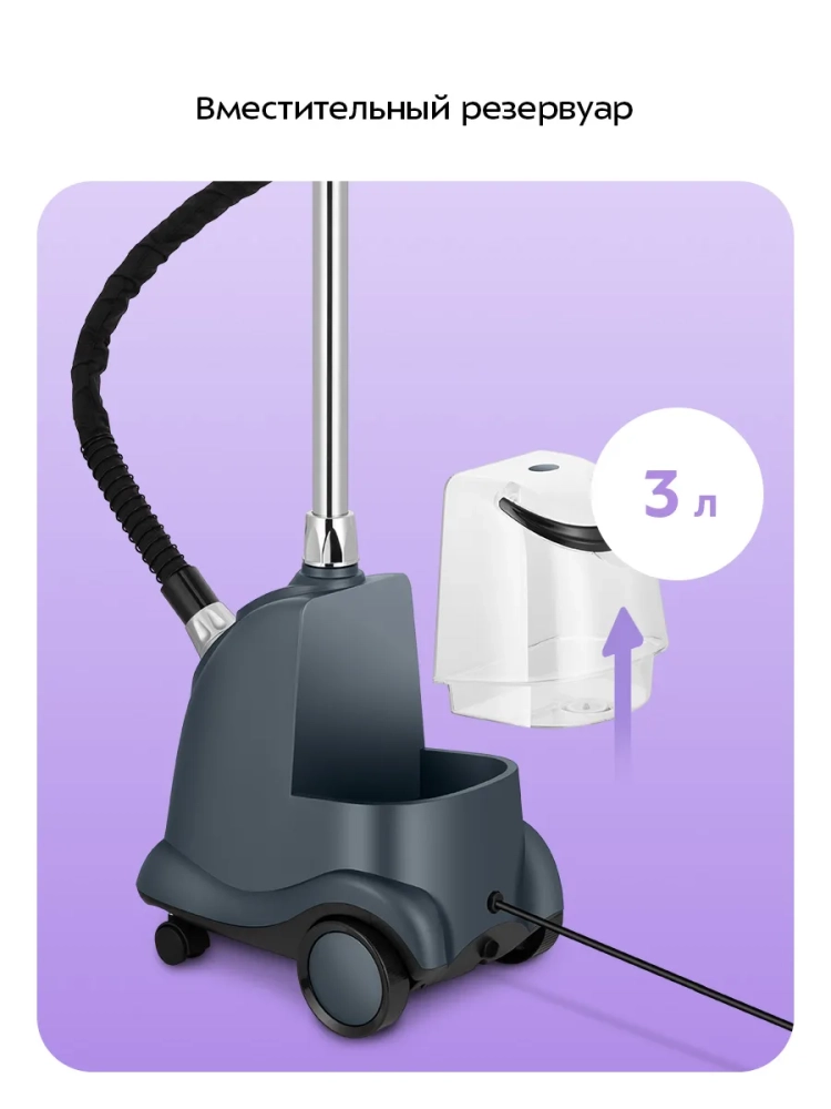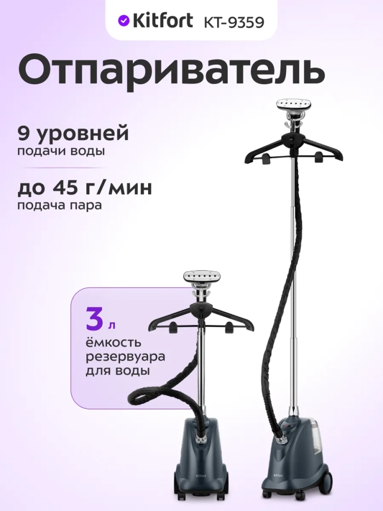 Отпариватель Kitfort КТ-9359 позволяет быстро прогладить вещи и изделия из текстиля. В отличие от утюгов, которыми гладят ткани и одежду, расположенные горизонтально, отпаривателем можно обрабатывать одежду и ткани, расположенные как горизонтально, так и вертикально с насадками. При этом одежда может висеть на вешалке отпаривателя, на обычной вешалке, подвешенной к отпаривателю, на сушилке для белья или на веревке. Отпариватель — серьезный конкурент паровых утюгов, это более функциональное и универсальное устройство, чем утюг. Кроме глажки и отпаривания, отпариватель обрабатывает вещи мощной струей горячего пара, таким образом производя чистку и дезинфекцию. Помимо бытового отпаривания одежды вы можете отпарить занавески и портьеры (для этого их не обязательно снимать), обивку мягкой мебели и матрасы. При этом вы не только разгладите складки, но и освежите вещи, а также продезинфицируете их, так как горячий пар хорошо убивает пылевых клещей и другие микроорганизмы. Для достижения лучшего эффекта при чистке можно надеть на утюжок ворсовую щетку-зажим. Очиститель позволяет прогладить вещи, которые обычно не гладят, например, пышные платья со сложной структурой, шубы и дубленки. Также с его помощью можно освежить к сезону вещи, у которых при хранении появился затхлый запах — отпариватель эту проблему решает без стирки. Пар довольно хорошо устраняет посторонний запах с одежды. Например, если вы находились в прокуренном помещении, и одежда пропахла табаком, то с помощью отпаривателя можно быстро убрать запах и освежить ее. Напряжение: ~220–240 В, 50/60 Гц. Мощность: 2200 Вт. Класс защиты от поражения электрическим током: I. Емкость резервуара для воды: 3 л. Время разогрева: до 45 с. Максимальная подача пара: 45 г/мин. Время подачи пара: ≥66 мин. Ширина вешалки: 46 см. Длина парового шланга: 1,6 м. Длина шнура: 1,9 м. Высота отпаривателя с разложенной стойкой: 1,7 м. Размер устройства: 250 х 370 х 380 мм.