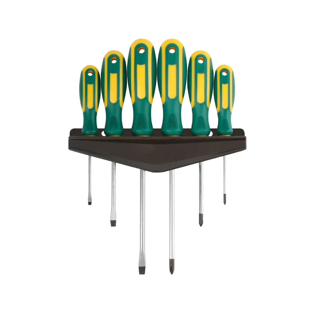 Набор 6 шт. на пластиковом держателе. Отвертки: SL3 x 75, SL5 x 100, SL6 x 150, PH0 x 75, PH1 x 100, PH2 x 150. Материал: жало из хром- ванадиевой стали, магнитный наконечник, пластиковая прорезиненная ручка.