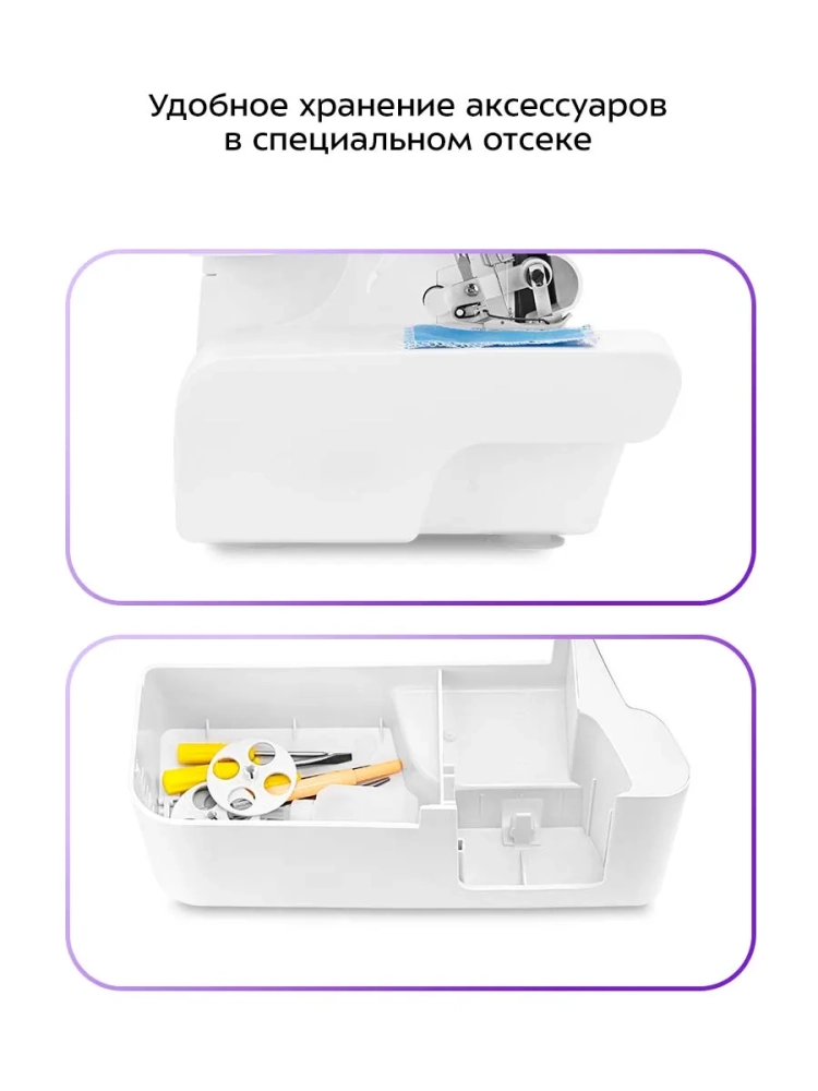 В отсеке для аксессуаров удобно хранить дополнительные иглы и другие мелкие принадлежности. Благодаря рукавной платформе на оверлоке удобно обрабатывать узкие детали одежды, например, манжеты рукавов. Для очистки оверлока в комплекте идет специальная щеточка для чистки.