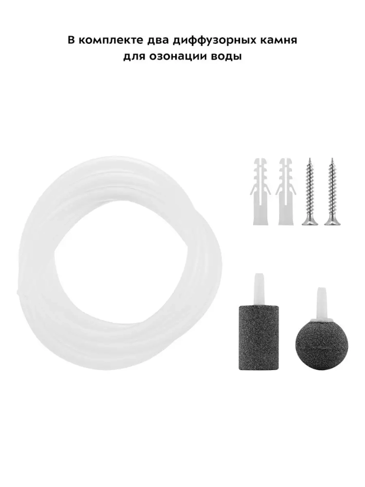 В комплекте есть 2 диффузорных камня. Они играют роль рассекателя струи озона, создавая большую площадь взаимодействия молекул озона с водой. Сами камни не вступают в реакцию с озоном. Так как они находятся в озоновой среде, диффузорные камни не являются источниками загрязнений, но, не смотря на это, их нужно тщательно промывать после контакта с продуктами животного происхождения.