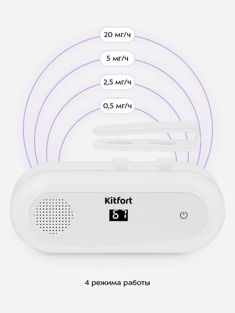 Озонатор KT-3866 оснащен четырьмя режимами работы, которые отличаются количеством вырабатываемого озона. Управление устройством осуществляется одной кнопкой.