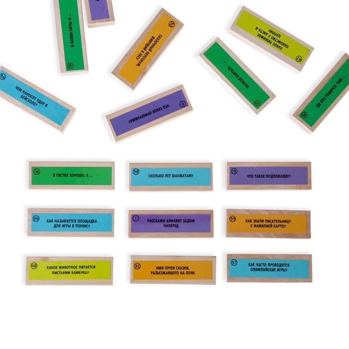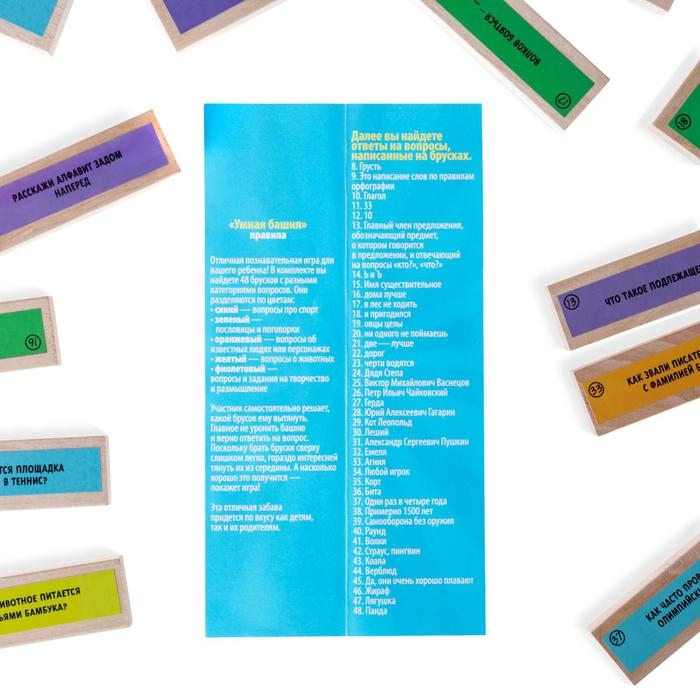 Очень просто! Построив разноцветную башню, вы вытягиваете брусок на ваш выбор так, чтобы башня не развалилась. Вытянули – отвечайте на вопрос! Ответили – оставляете брусочек у себя, чтобы потом было удобнее считать баллы. А если не ответили или ответили неправильно – складываете эти бруски на башню сверху. Побеждает тот, у кого на конец игры больше брусков.Что входит в набор?