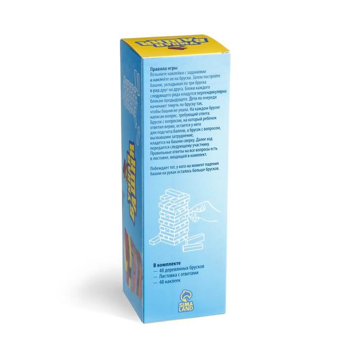 Как же много занимательных настольных игр! Но больше всего ценятся именно те, в которые не только весело играть, но и познавательно! Ведь в процессе игры вы не только отлично проведете время в компании друзей, но и узнаете много нового и интересного – все бруски башни содержат занимательные вопросы. Игра разнообразит любое мероприятие и подарит массу положительных эмоций!Как играть?
