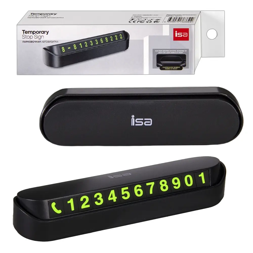 Автовизитка с наборным номером контактного телефона. Оригинальное и удобное решение предоставления информации. Легко устанавливать на приборную панель автомобиля с помощью двухстороннего скотча 3М. Скотч не портит пластик, не оставляет на нём следов. Вы так же можете не фиксировать автовизитку на скотч, а устаовить её на время вашего отсутствия в автомобиле и по возвращении просто убрать. Отсек с цифрами открывается/закрывается нажатием на заднюю/переднюю часть корпуса верхнего отсека автовизитки.