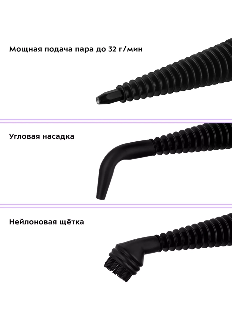 Пароочиститель очищает поверхности от пятен при помощи горячего пара, однако не все пятна могут быть удалены таким способом. В случаях серьезного загрязнения используйте нейлоновую круглую щетку, а также чистящие средства, которые надо наносить на загрязнения. Для очистки окон, зеркал и кафельной плитки используется насадка с резиновым скребком. Чтобы отпаривать одежду и чистить обивку мягкой мебели в комплекте есть тряпка для отпаривания, которая надевается на насадку для отпаривания. Благодаря наличию парового шланга есть возможность очистить труднодоступные места. Угловая насадка справится с загрязнениями в таких труднодоступных местах, как углы и радиаторы отопления.