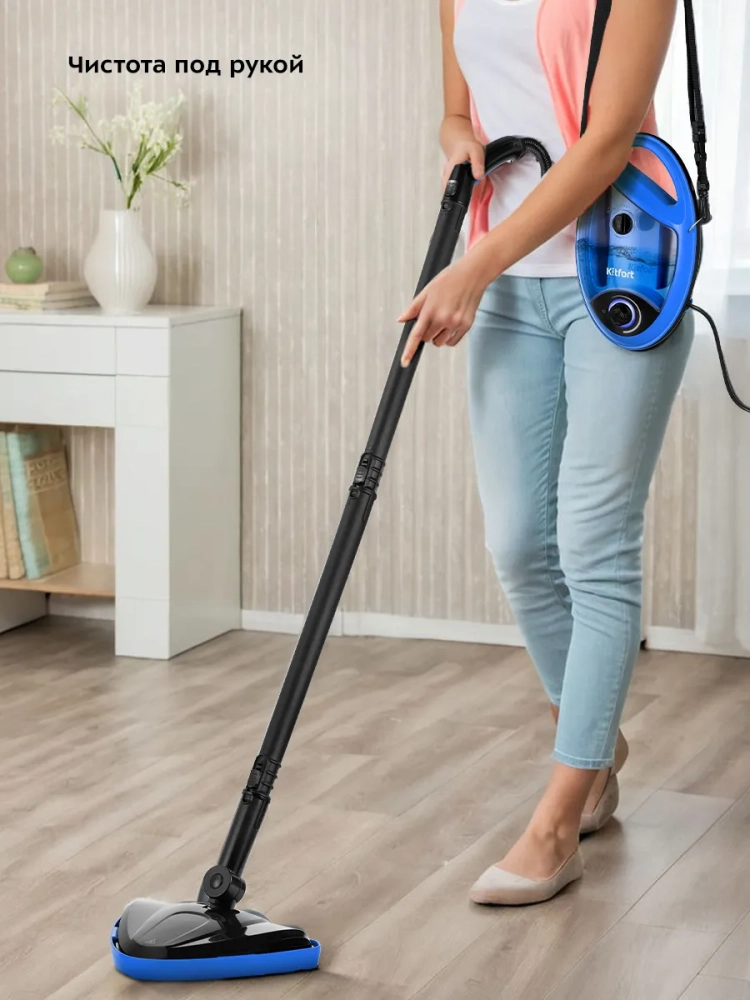 На корпусе пароочистителя есть ручка для переноски. Сам корпус небольшого размера, к нему крепится специальный ремень, с помощью которого пароочиститель можно повесить на плечо или на пояс во время уборки. На задней стороне пароочистителя есть специальная пластиковая пластина, которая не нагревается, благодаря чему вы не обожжетесь о корпус устройства, если будете держать его на себе. Пароочиститель очищает поверхности от пятен при помощи горячего пара, однако не все пятна могут быть удалены таким способом. В случаях сильного загрязнения используйте вспомогательные насадки из комплекта, а также чистящие средства, которые надо наносить на загрязнения. Большое количество насадок в комплекте поможет очистить труднодоступные или сильнозагрязненные поверхности.