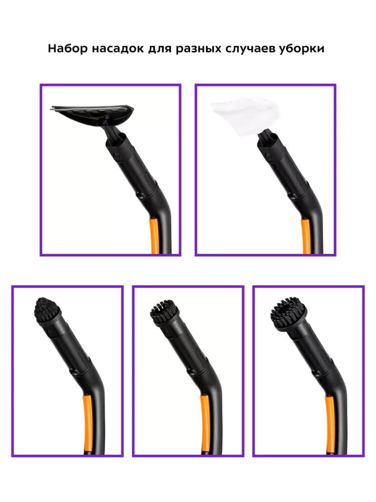 На корпусе пароочистителя есть ручка для переноски. Сам корпус небольшого размера, к нему крепится специальный ремень, с помощью которого пароочиститель можно повесить на плечо или на пояс во время уборки. На задней стороне пароочистителя есть специальная пластиковая пластина, которая не нагревается, благодаря чему вы не обожжетесь о корпус устройства, если будете держать его на себе. Пароочиститель очищает поверхности от пятен при помощи горячего пара, однако не все пятна могут быть удалены таким способом. В случаях сильного загрязнения используйте вспомогательные насадки из комплекта, а также чистящие средства, которые надо наносить на загрязнения. Большое количество насадок в комплекте поможет очистить труднодоступные или сильнозагрязненные поверхности.