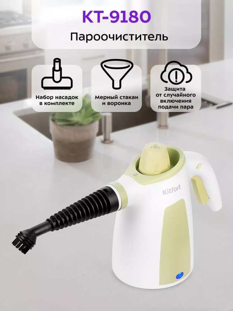 Пароочиститель Kitfort КТ-9180 — многофункциональный прибор, способный заменить дезинфектор, стеклоочиститель и отпариватель. Главное преимущество пароочистителя — прибор безопасен для здоровья человека и не приносит вреда окружающей среде. При этом прибор очень удобен в использовании и работа с ним не требует особых навыков и умений.