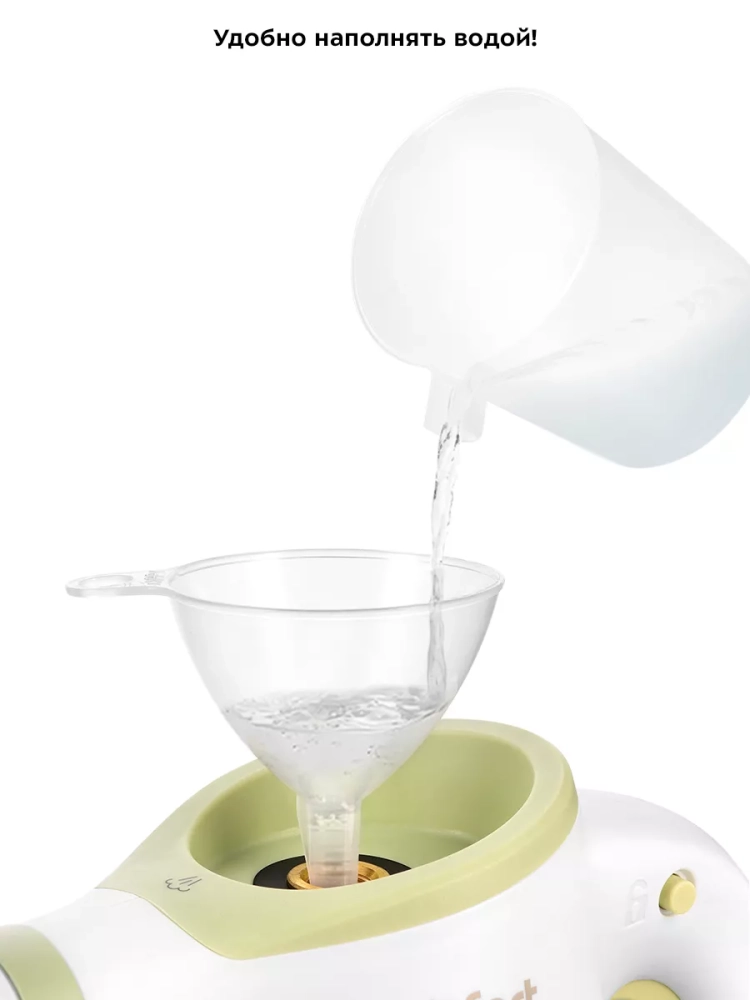В устройство удобно наливать воду благодаря наличию воронки и мерного стакана.