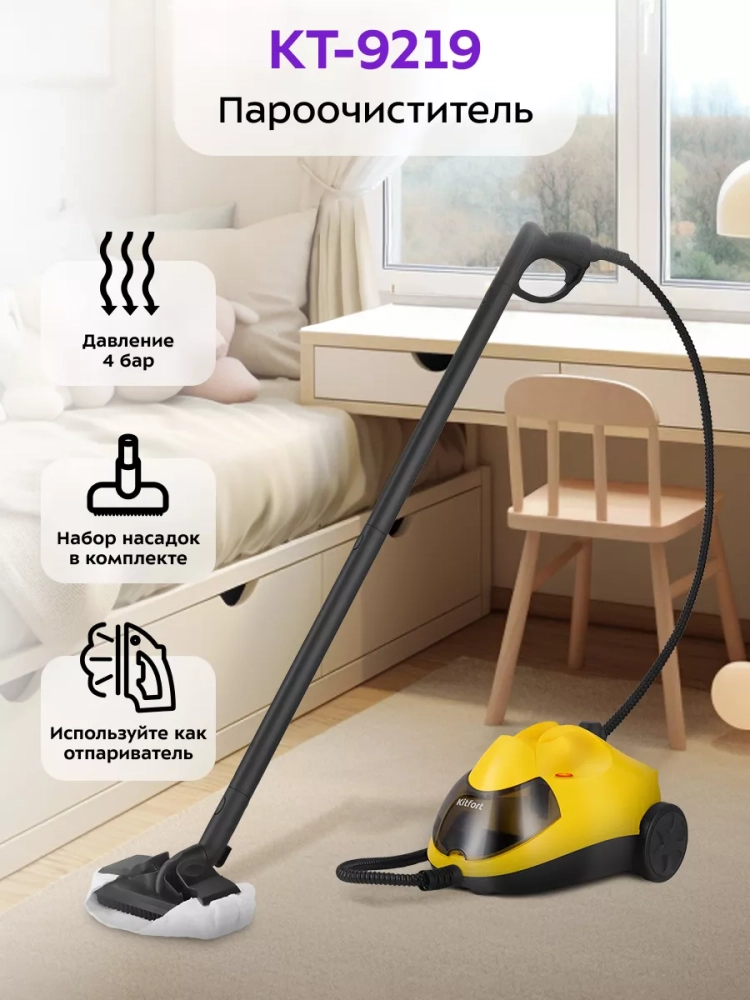 Пароочиститель Kitfort КТ-9219 предназначен для уборки интерьеров, полов и поверхностей, выдерживающих влагу и высокую температуру, а также для отпаривания тканей.