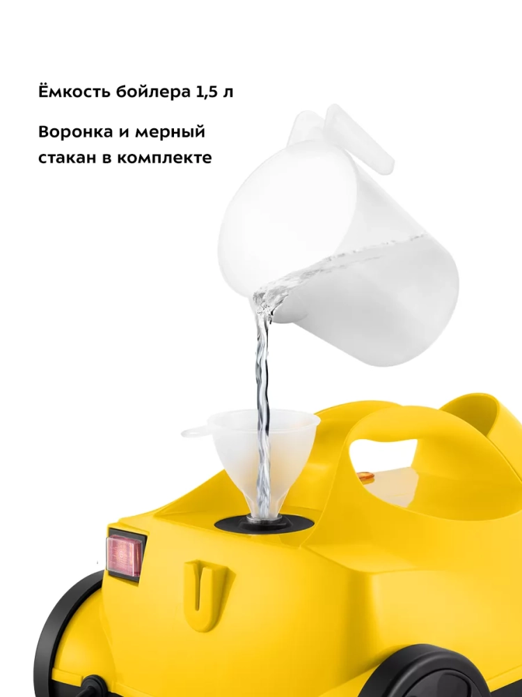На корпусе пароочистителя есть ручка для переноса. Колеса позволяют с легкостью перемещать пароочиститель, не поднимая его. Пароочиститель очищает поверхности от пятен при помощи горячего пара, однако не все пятна могут быть удалены таким способом. В случаях сильного загрязнения используйте вспомогательные насадки из комплекта, а также чистящие средства, которые надо наносить на загрязнения. Большое количество насадок в комплекте поможет очистить труднодоступные или сильнозагрязненные поверхности.